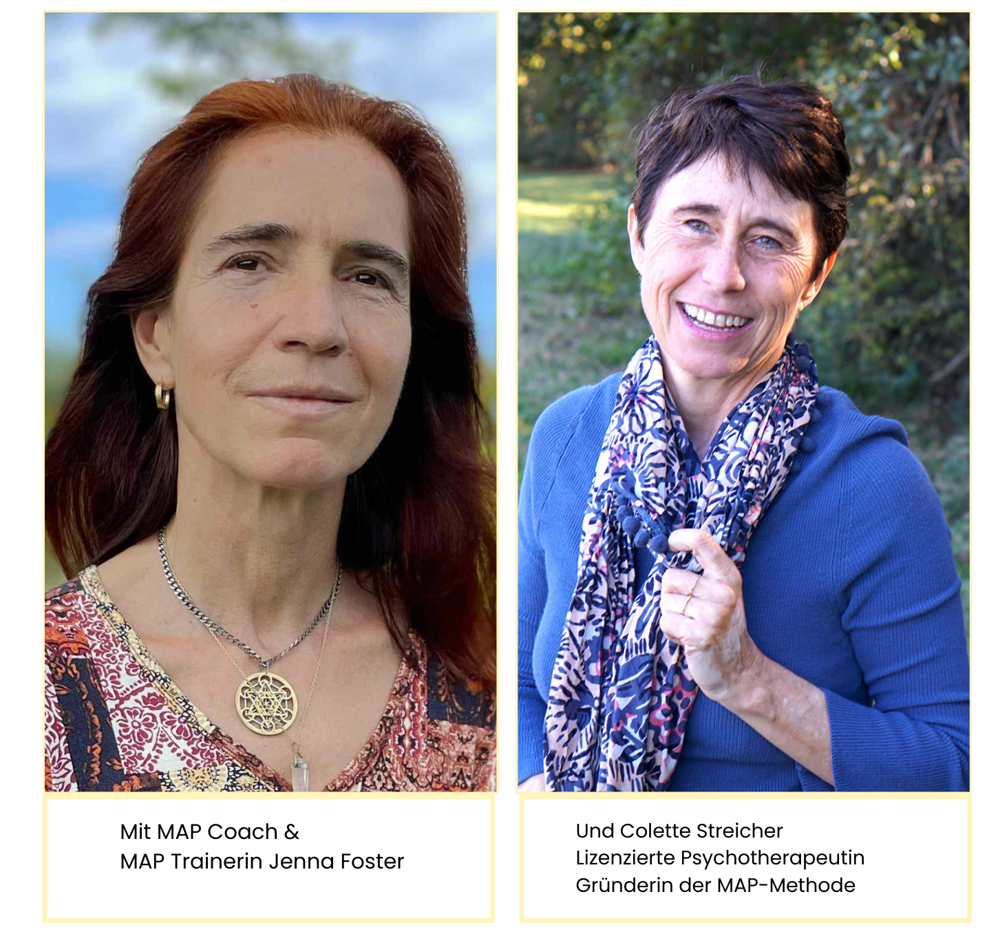 "Ich hatte das Glück, als Freiwillige für eine MAP-Sitzung mit Colette ausgewählt worden zu sein. Während der Sitzung arbeitete ich an einem schweren, lähmenden Angst- und Traumaproblem, das mich seit 50 Jahren begleitete, und sank von einem Belastungswert von 9 auf 2, als wir fertig waren. Der Zustand änderte sich von Herzklopfen und schweißnassen Händen hin zu Ruhe, Akzeptanz und dem Bedürfnis zu lächeln. Wie wunderschön. Erst gestern erfuhr ich vom Tod eines lieben Freundes meines Sohnes, der vor vier Jahren an derselben Krankheit verstorben war. Also jahrelang eine Angst nach der anderen in meinem Leben. Aber heute und jetzt, heute Abend, etwa 7 Stunden nach der MAP-Sitzung, spüre ich einen inneren Frieden und, ich muss es zugeben, Freude. Ich hoffe, Colette hat recht; sie benutzte das Wort ‚dauerhaft‘. Erstaunlich. Danke, danke.."